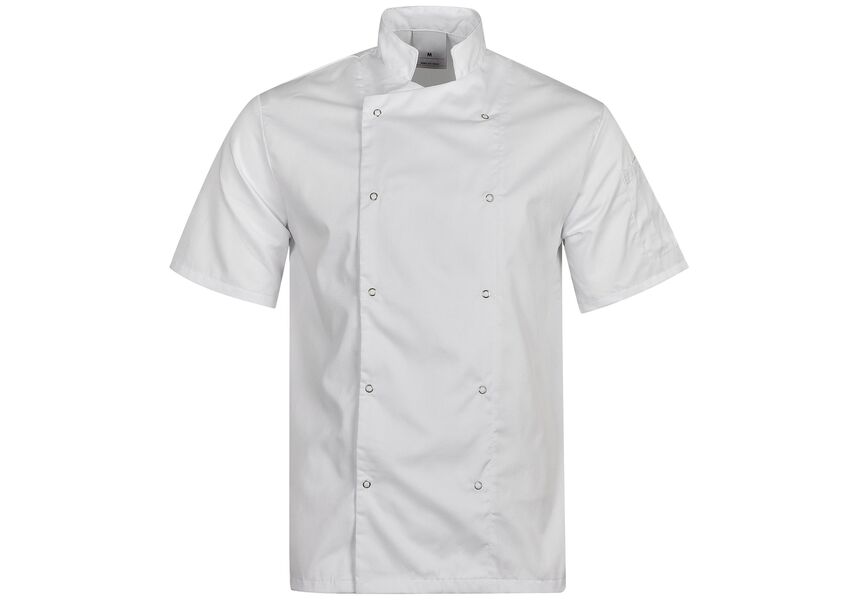 Σακάκι του σεφ με κοντά μανίκια. Στερέωση διπλού κουμπιού με κουμπιά και τσέπη με μανίκι. Ύφασμα: 65% PE / 35% CO, 130gr / m2